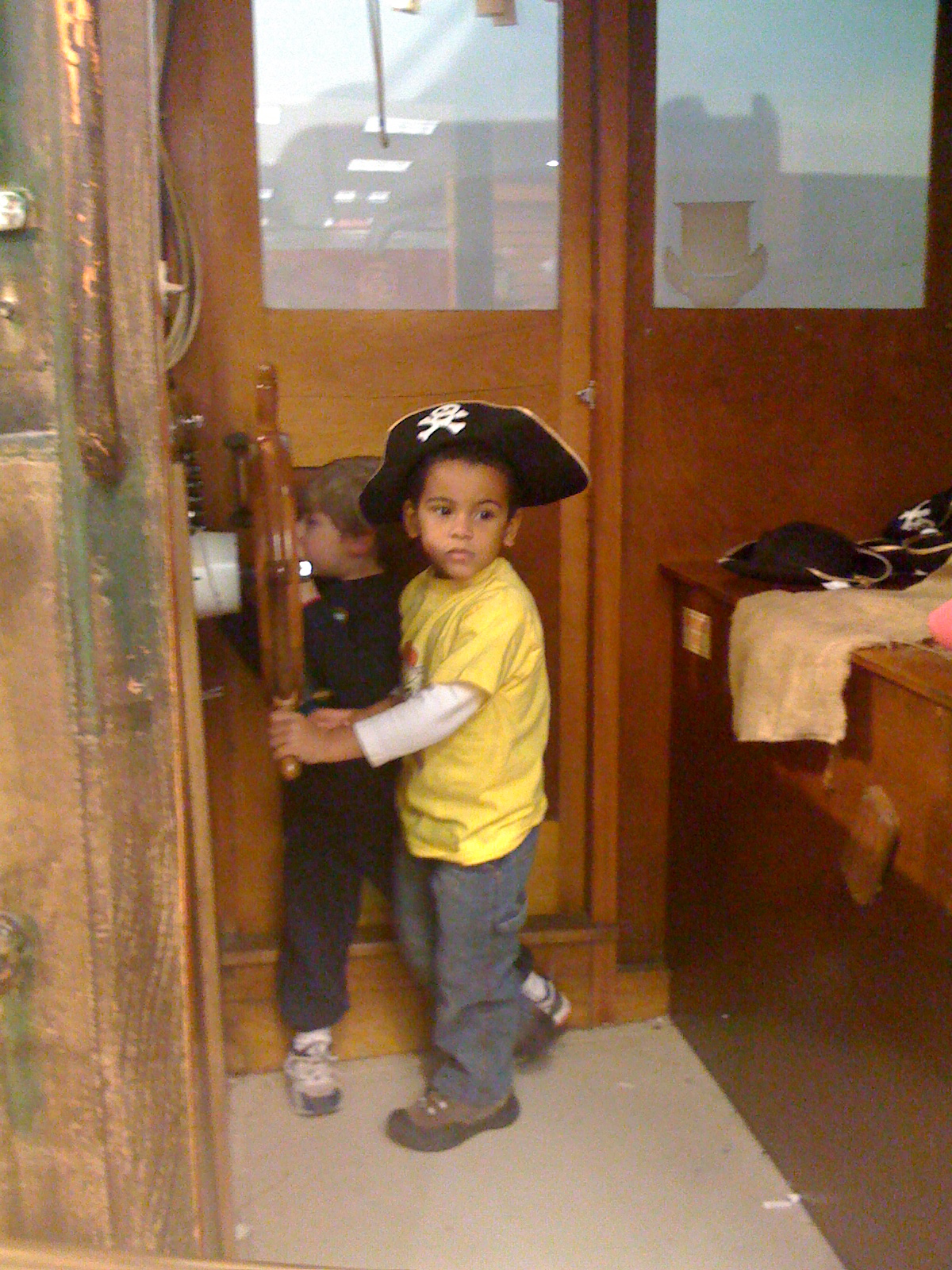 Now that’s some popcorn! Carlos was in toddler heaven. We walked through the toy store. Carlos played on a pirate ship with other kids. There were pirate hats, a big steering wheel, ropes, nets and lots of other things that made it fun for the little ones.