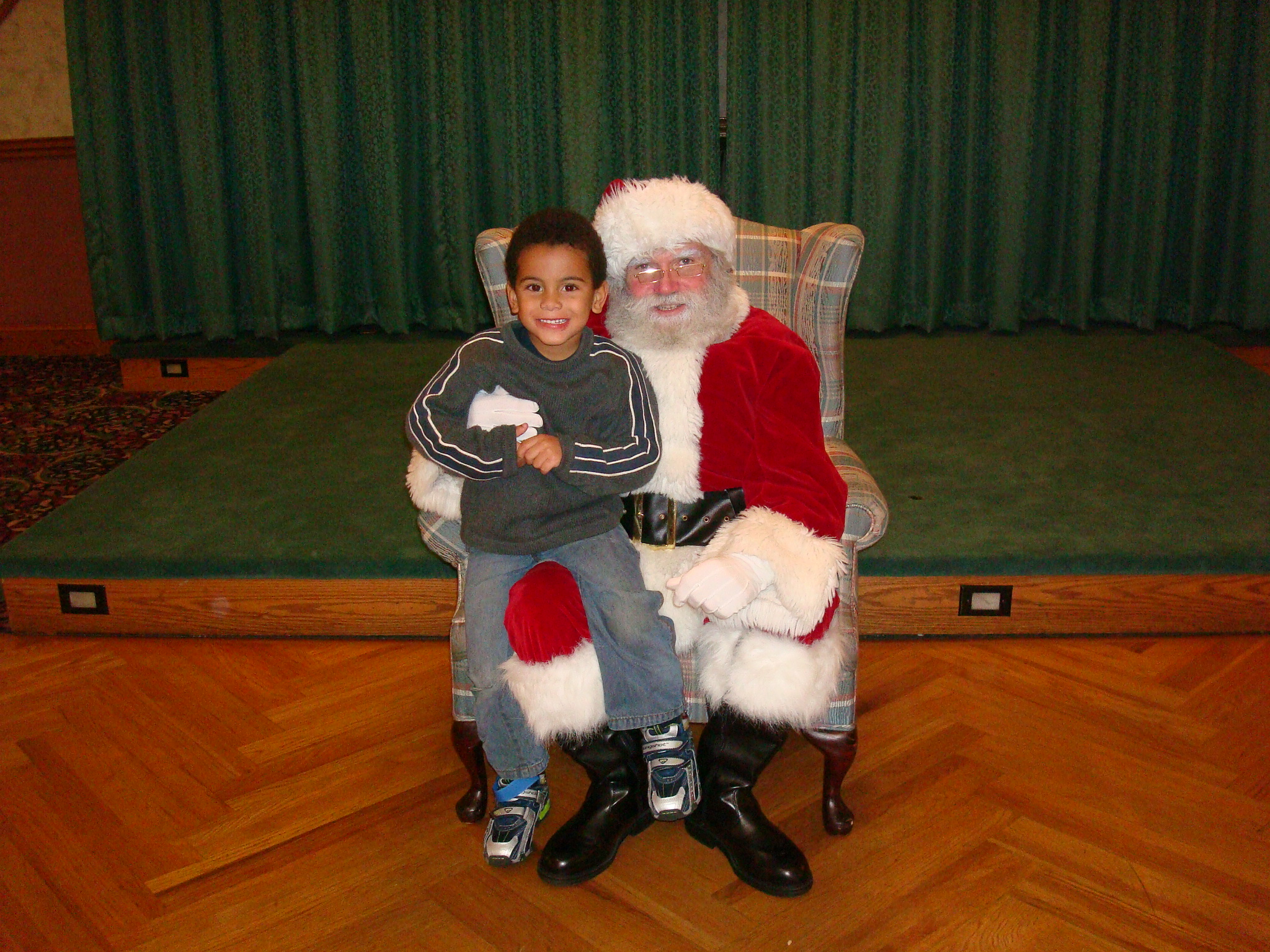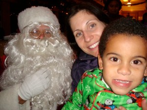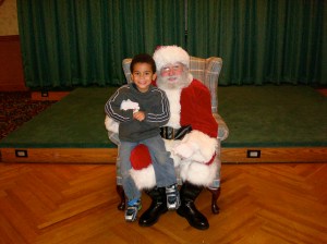 After the bubble show Santa arrived. Instead of waiting in the long line a few of us let the kids play and got in line at the end. They passed out gifts to all of the children. Carlos was thrilled with his Crayola game and race car track. Surprisingly when it was time he actually sat on Santa’s lap and told him what he wanted.