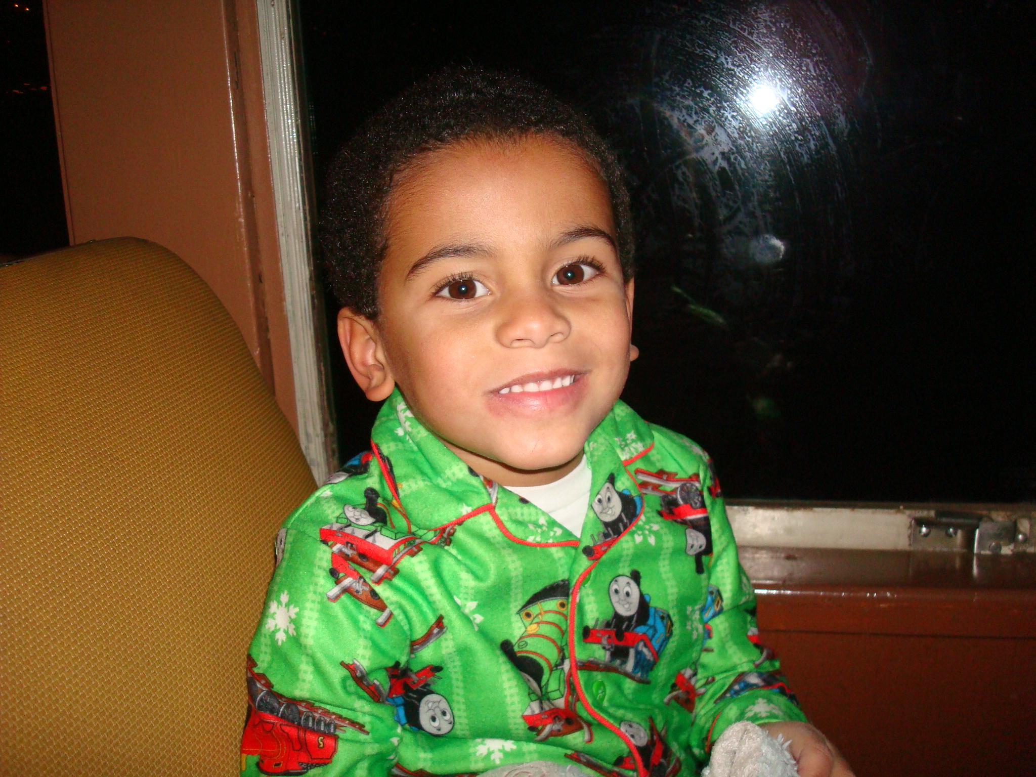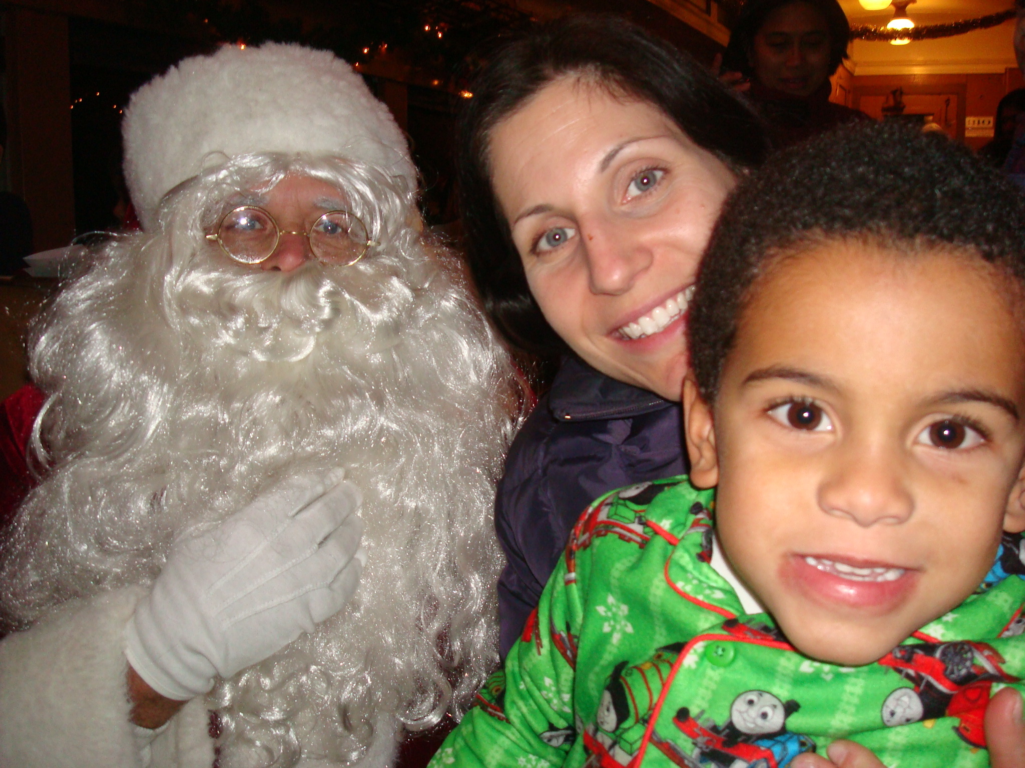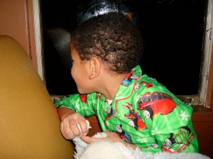 We went to the North Pole tonight. At least Carlos thinks that we did. Actually we went on the Polar Express train ride from Lenox to Stockbridge. Carlos wore his new Christmas Thomas the Train pajamas. It was cold and felt like the North Pole when we arrived at the station. Everything was decorated with lights.