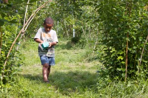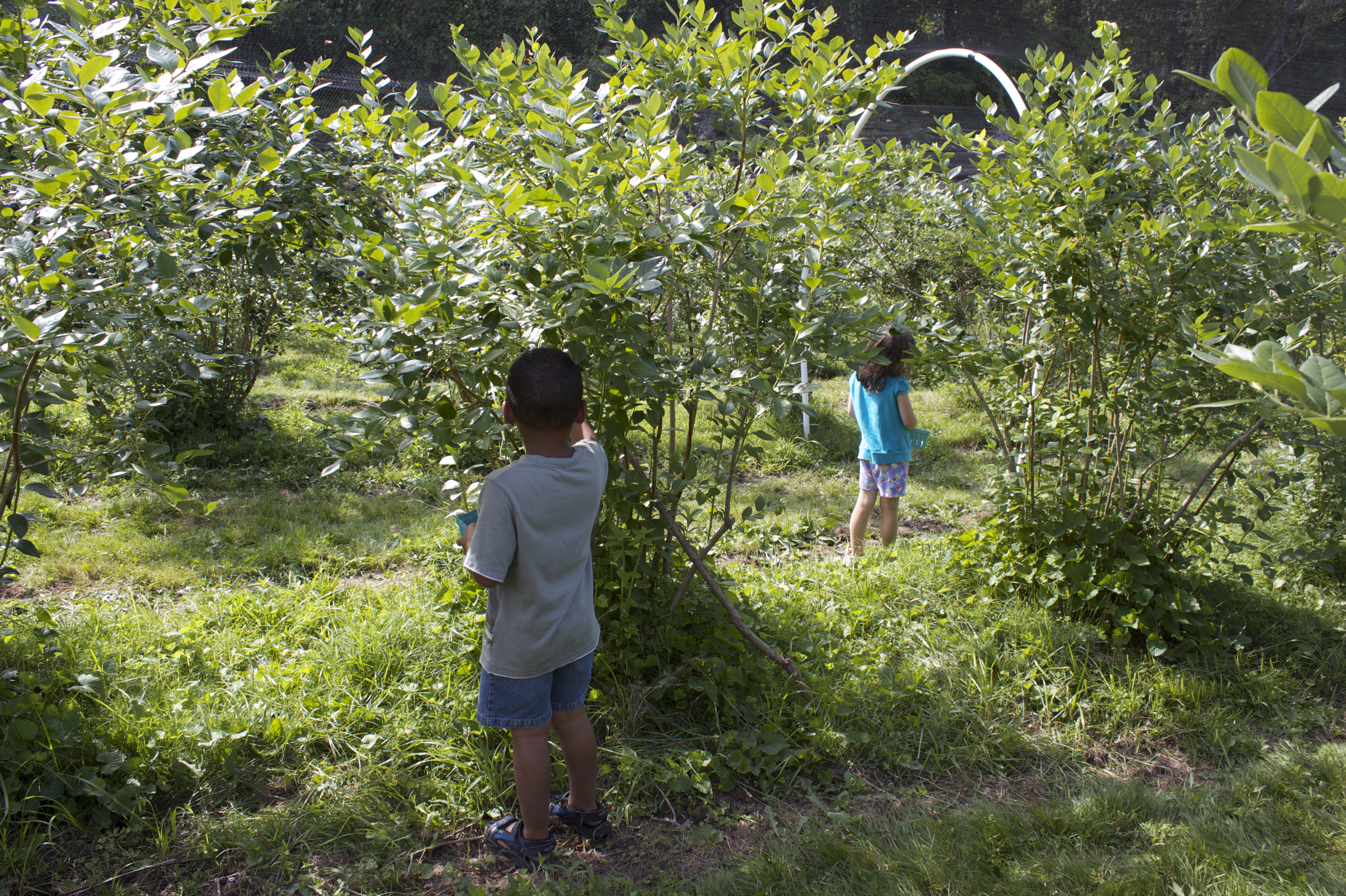 On Thursday we had the opportunity to go blueberry picking. Four adults and six children let loose in the blueberry fields at Birdhaven Blueberry Farm…watch out! It was a gorgeous afternoon. The kids were reeling with energy after a long day of camp at the YMCA. Our guide, John, showed us which bushes were the best and then we were on our own with plastic buckets attached to our waist. The kids had smaller containers that they were supposed to fill and then empty into our larger buckets.