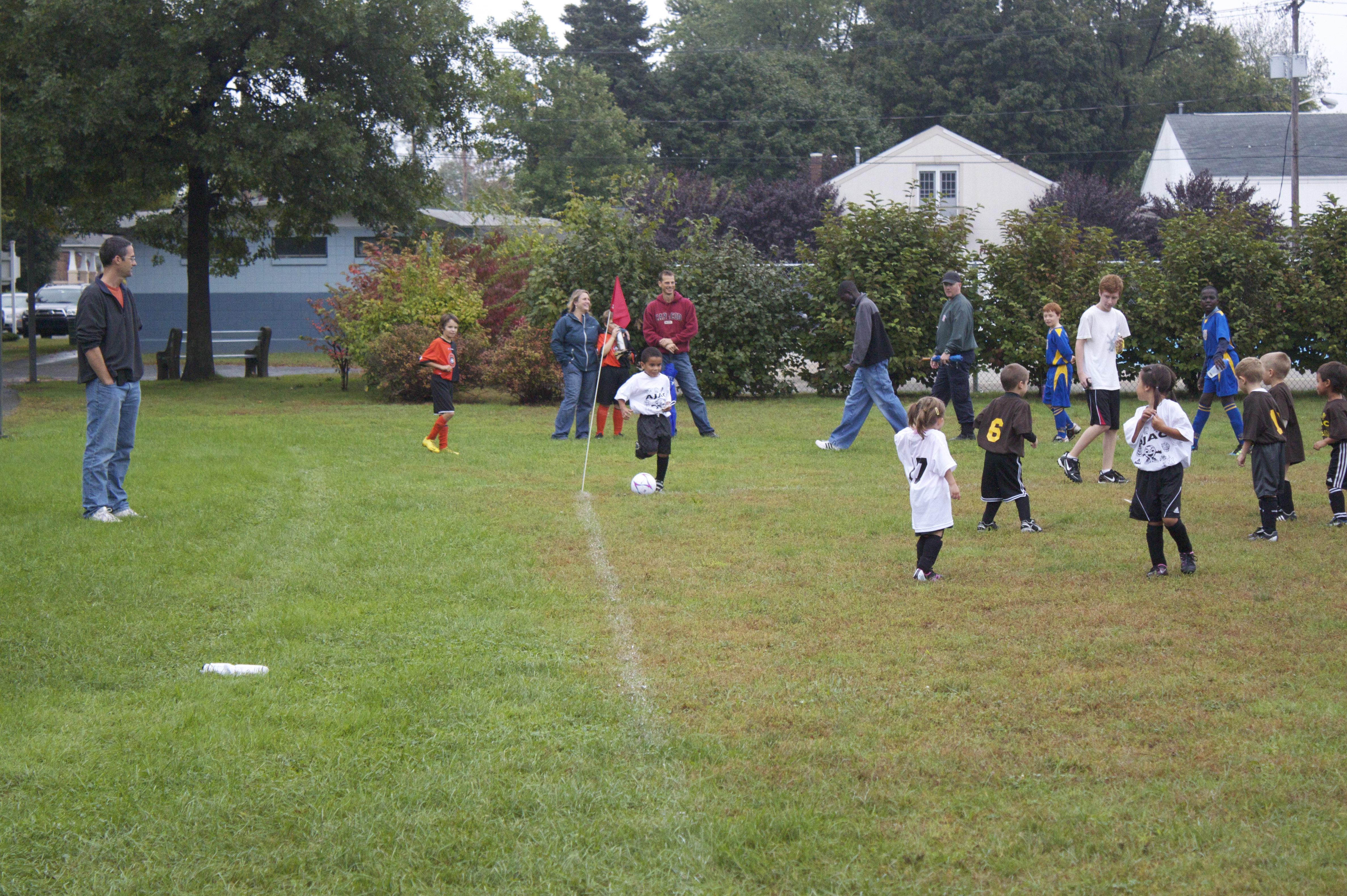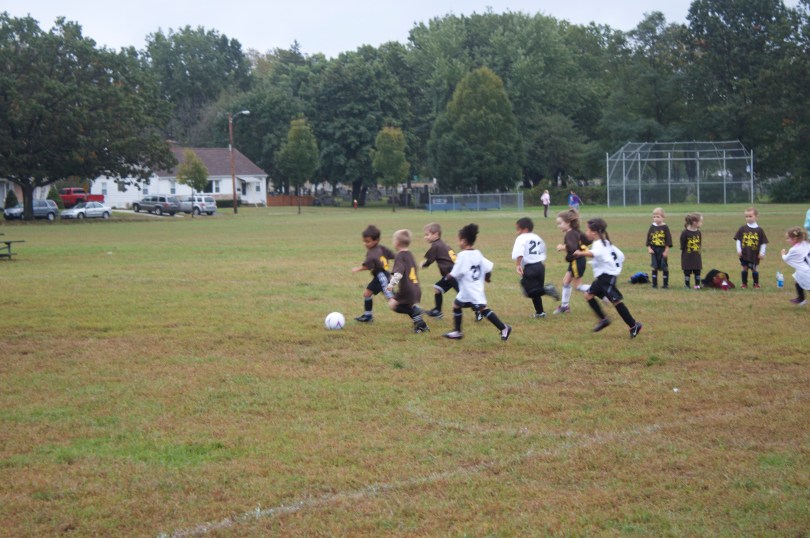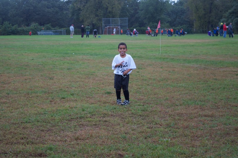Game day was a hoot. I have not laughed so hard in ages. Picture a bunch of fidgety four year olds chasing a soccer ball around a field in a cluster. There were two nets on either side but no goalies! Most of the time the kids couldn’t remember which goal they were supposed to shoot into and ended up shooting at the wrong goal. Then much to their chagrin after half time they switched sides causing mass confusion as parents hollered “other way, turn it around.” The referees certainly got a work out as the ball was out of play more than it was on the playing field.