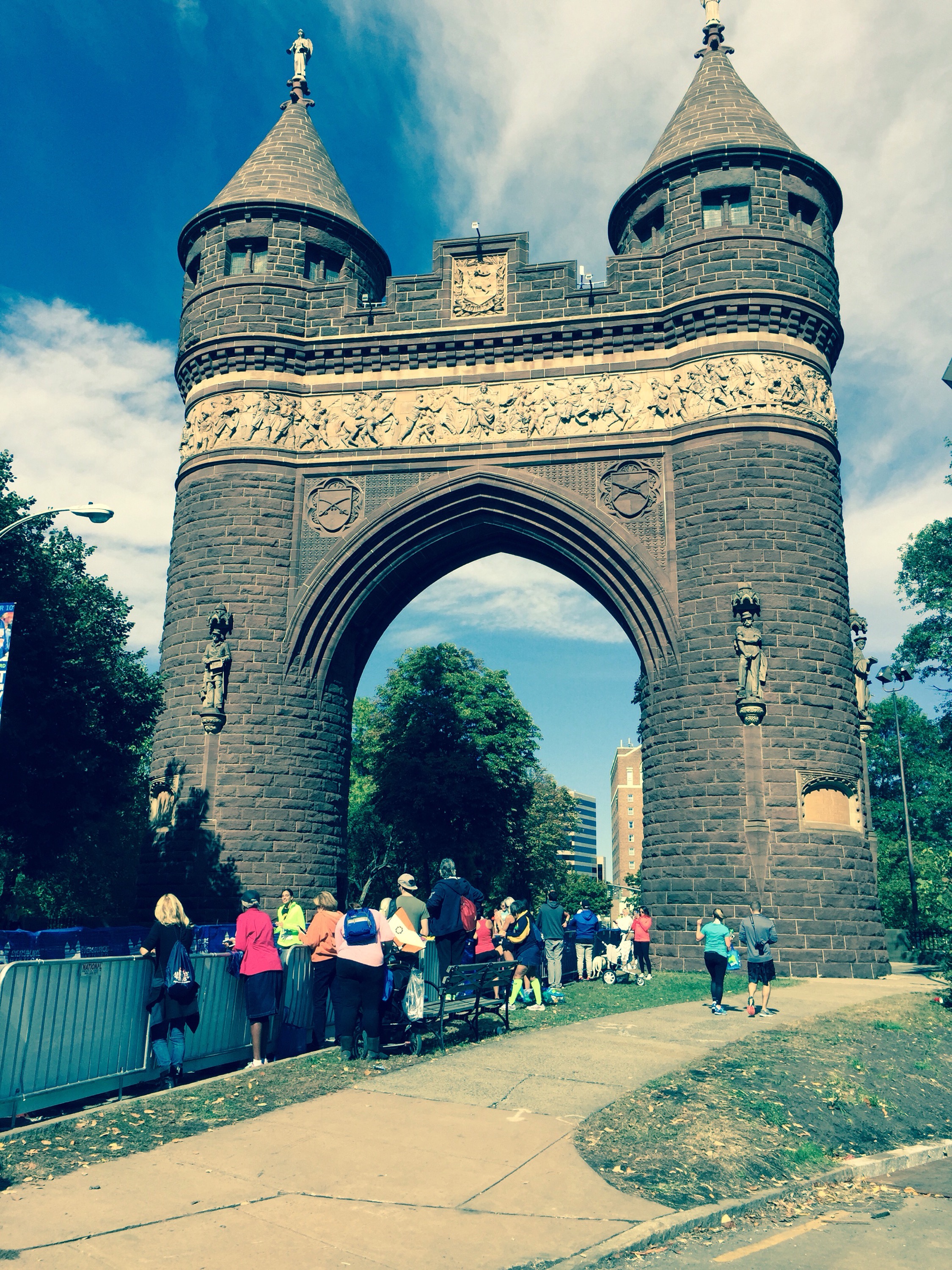 From there I ran to the finish at a steady pace. I knew I wasn’t going to meet my goal of a sub-4:30 marathon, but I also knew I had run my best race. Mile 25 was a bit of a surprise. We had to go up and over the river which meant an incline. At the end of the overpass we encountered another hill which felt like a mountain after running for so long. Finally I saw the Mile 26 sign and those last 2 tenths of a mile were a blur although they felt like they stretched out for a mile. I ran my heart out and finally came to the arches.