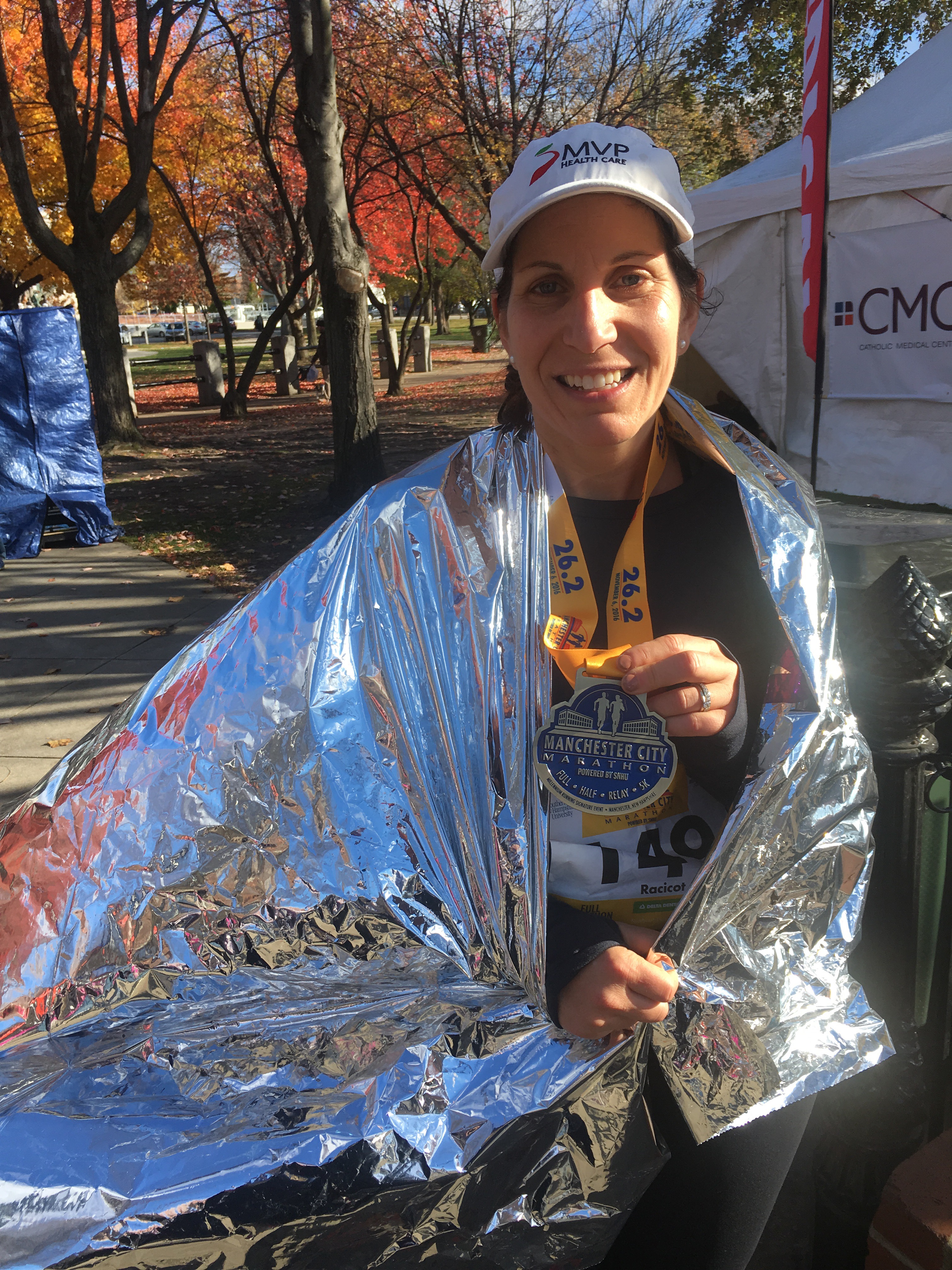 I had an internal conversation going on throughout the first 15 miles about how magical it would be if I could will myself into feeling that great until the end of the race, but by mile 16 there were twinges, mile 17 the aches started to creep in, mile 18 my feet were screaming at me, mile 19 mental math begins to fail me as I try to add up how much longer I need to run, mile 20 I just want this to be over because my legs hurt, mile 21 I can hear my yoga instructor in my head telling me to unclench my toes and breathe into the pain, mile 22 breathing breathing breathing, mile 23 I got this, I can do this, mile 24 I’m running my 7th marathon what?!! wait we have to go up that huge hill we already climbed at mile 4.5 well that’s just cruel, mile 25 hey it’s the finish line and I have to run right by it for the second time, back over that bridge we already ran over around mile 5 and back the other way, oh not another hill, that’s it I want this done…as though a mighty wind blew from behind suddenly my legs took on a life of their own and I ran as hard as I could for those last two tenths of a mile. Mile 26.2 tears!
